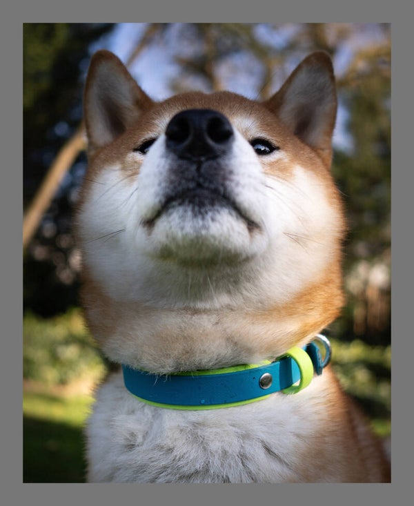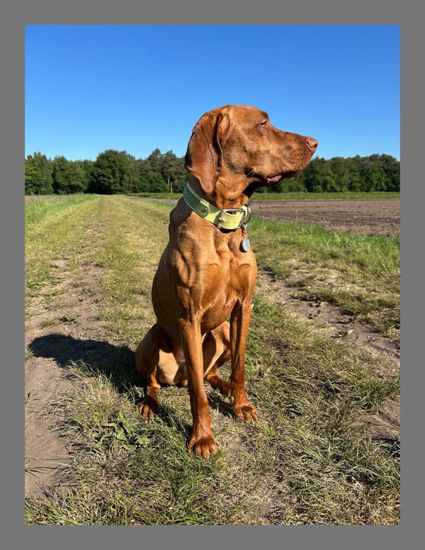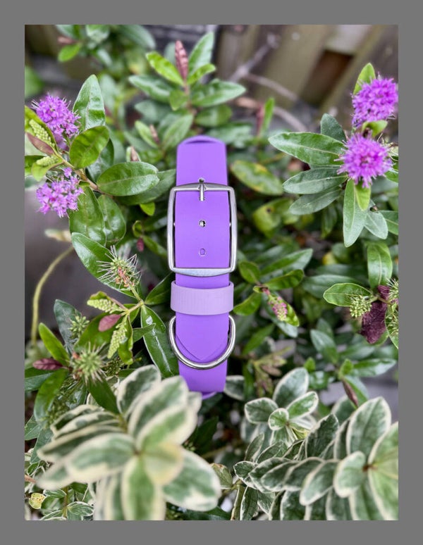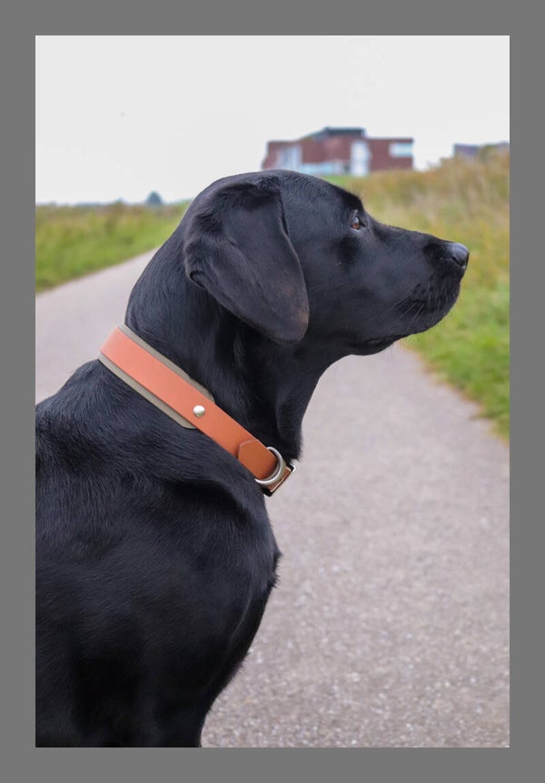 Stijlvolle en praktische halsband. Biothane lijkt erg op Leer, het is supersterk, snijd niet in je handen en neemt geen water op! Het is eenvoudig schoon te maken met een vochtige doek.