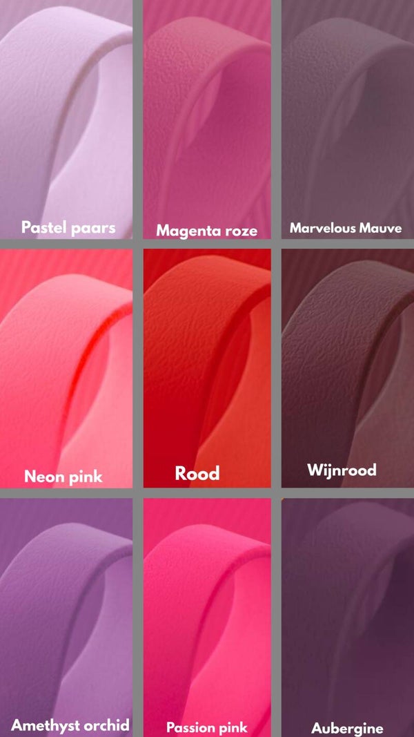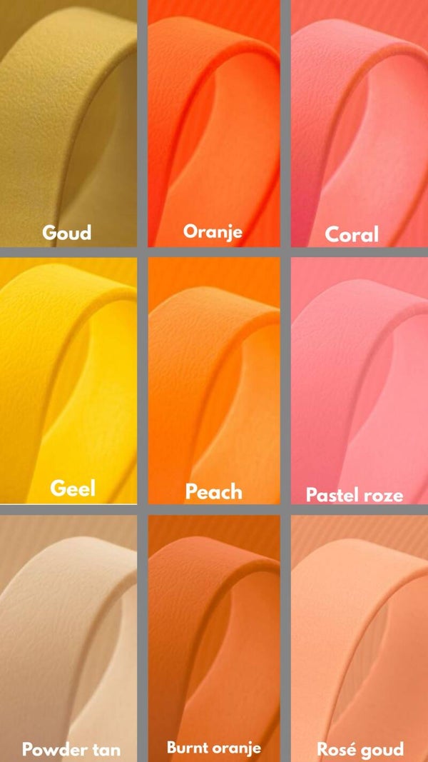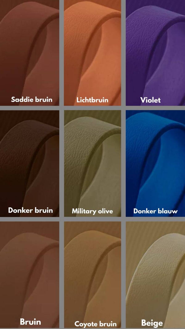 Let op! De kleuren van de afwerking kunnen vervagen door gebruik. Zorg dat je de afwerking regelmatig schoon maakt voor het mooiste resultaat. Kies je voor rvs? dan worden de musketon, tri glide en ring in rvs gemaakt.