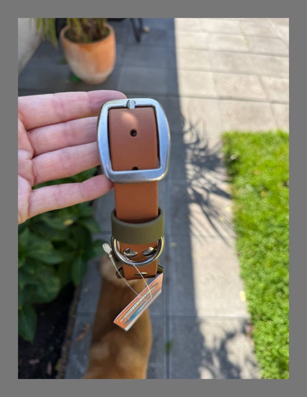 Stijlvolle en praktische halsband. Biothane lijkt erg op Leer, het is supersterk, snijd niet in je handen en neemt geen water op! Het is eenvoudig schoon te maken met een vochtige doek.