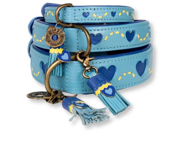 Geef je hond die trendy look met de Sky Halsband. Deze hippe leren halsband in een frisse blauwe tint is perfect voor honden die graag in stijl lopen. De uitgesneden hartjes geven het ontwerp een speelse, moderne twist. Ideaal voor elke hond die een statement wil maken tijdens het uitlaten.