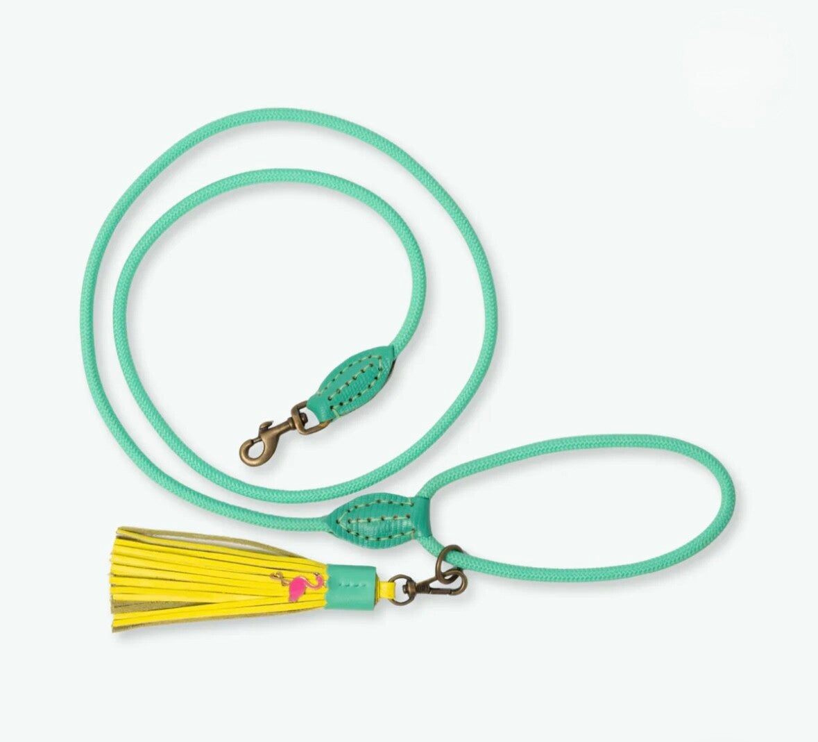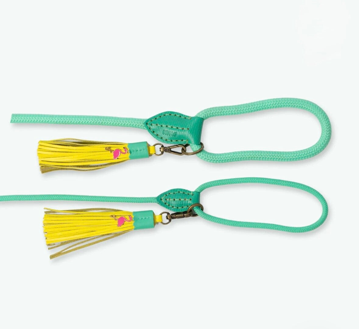 ❤ Turquoise touwriem met vrolijke flamingo-details en een speelse leren tassel